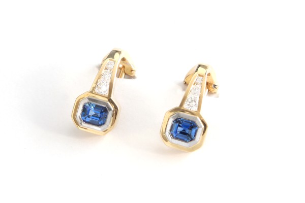 Ohrringe in 750/000 Gelbgold, 2 Saphire 1.15ct, 6 Brillanten Feinweiß Lupenrein (if/vs) zus. 0.30ct.
