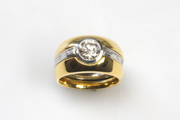 Brillantring Mittelstein 1.08ct hochfeines Weiß Lupenrein (hfw/if), Diamant Baguettes zus. 0.67ct Feinweiss (fw/if-vvs), 950/000 Platin 7.8gr, 750/000 Gelbgold 14,65gr.