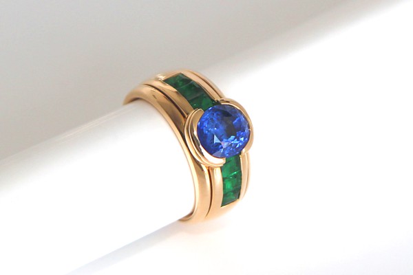 Ring aus 750/000 Rosegold 12.3gr, hochfeiner Saphir rund facettiert 2.82ct, 6 feine Smaragdcarrees 0.86ct.