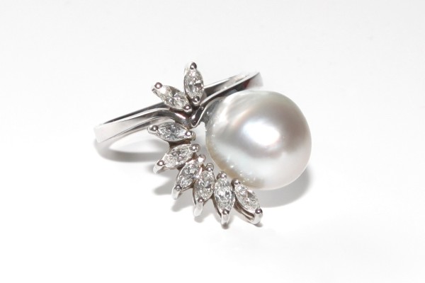 Ring aus 750/000 Weißgold, 1 feine Südseeperle, 8 Diamantennavettes Feinweiß Lupenrein (fw/if) zus. 0.76ct.