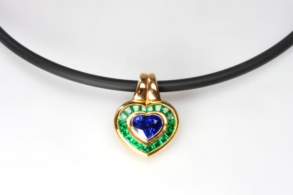Anhänger 750/000 Rosegold 30.60gr, ein feiner Saphir im Herzschliff facettiert 4.20ct, eingeschliffene Smaragde zus. 1.54ct.