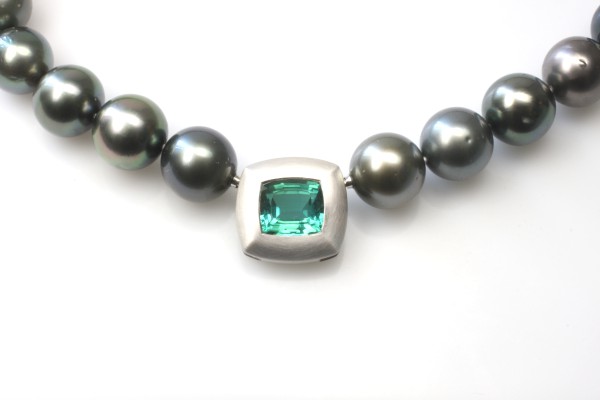 Der Turmalin kann auch als Anhänger auf einer dünnen Kette gestragen werden (Durchläufer).
