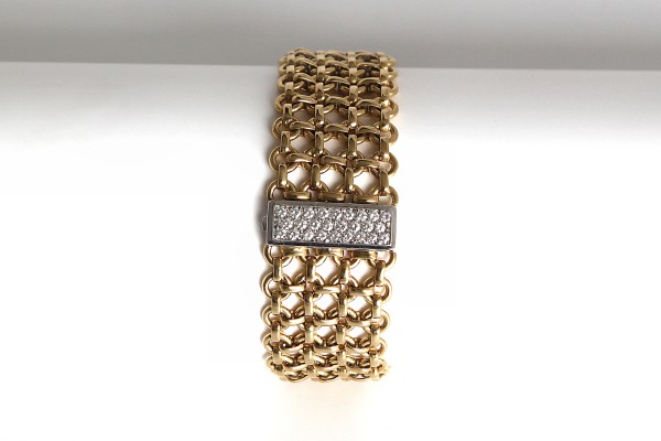 Kettenarmband in 750/000 Gelbgold mit WG/Brillantschloss, ausgefasst mit 0.72ct Brillanten feinweiß Lupenrein (fw/if). Gewicht des Armbandes 73.8gr.