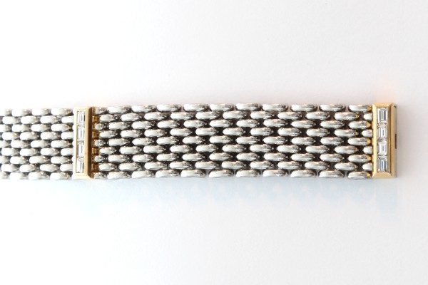Kettenarmband in 950/000 Platin 77.3gr und 750/000 Gelbgold 10.5gr mit Kastenschloss (unsichtbar), 12 Diamantbaguettes feinweiß Lupenrein (fw/if-vvs) 1.0ct.